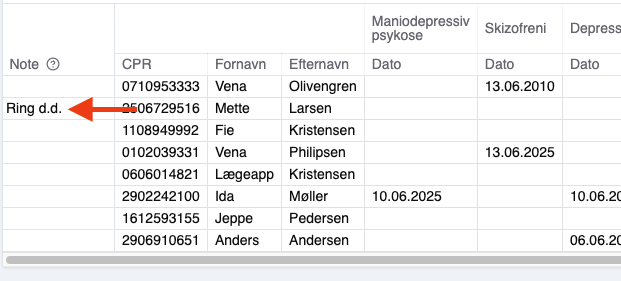 For at skrive en note, placeres cursoren i "Note" cellen ud for den ønskede patient, og noten indtastes. Noten gemmes automatisk.