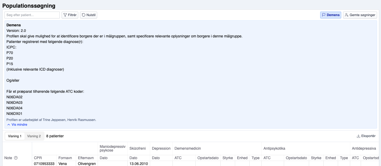 På nogle profiler er det muligt at se flere forskellige perspektiver på samme datasæt, eksempelvis profilen "Demens", hvor der er flere forskellige visninger. Her kan skiftes mellem dem ved at bruge fanerne "Visning 1", "Visning 2", mv.