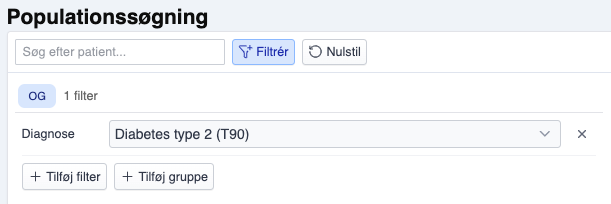 Såfremt der ønskes en yderligere filtrering end hvad den nationale populationsliste tilbyder, kan du tilføje yderligere filtre vha "Filtrér" eller at søge i søgefeltet.