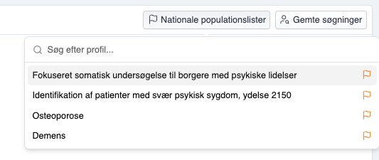 Ved hjælp af knappen "Nationale populationslister" kan de tilgængelige profiler fra Klinikkens Cockpit vælges. Når en profil er valgt vises automatisk filtrene