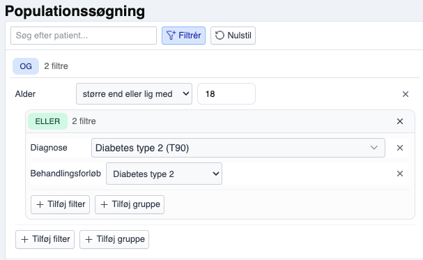 Eksempelvis er det muligt at finde alle patienter fra 18 år som enten har diabetes eller i et diabetesforløb på følgende måde: