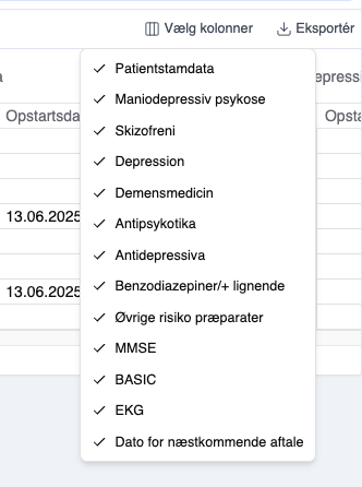 Ved tilføjelse af filtre tilføjes automatisk relevante kolonner til søgningen. Hvis der eksemplevis tilføjes en diagnose til filtrene, tilføjes der en kolonne visende diagnosens debutdato til søgeresultatet. Såfremt denne kolonne ikke ønskes vist, kan den fjernes som beskrevet under "Valg af kolonner".